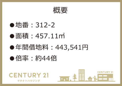 | 備考 | ■年間借地料:443,541円 ■倍率:約44倍 ーーーーーーーーーーーーーーーー ■下記2筆の軍用地も販売中です。 一括購入をご希望の方はお気軽にお問い合わせください。 ・地番312-1:457.19㎡ ・地番312-3:458.28㎡ |