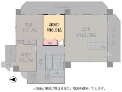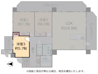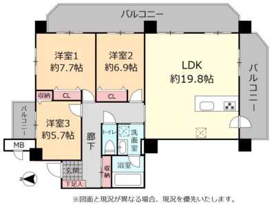 | 間取り | 3LDK(洋 7.7・6.9・5.7 / LDK 19.8) |