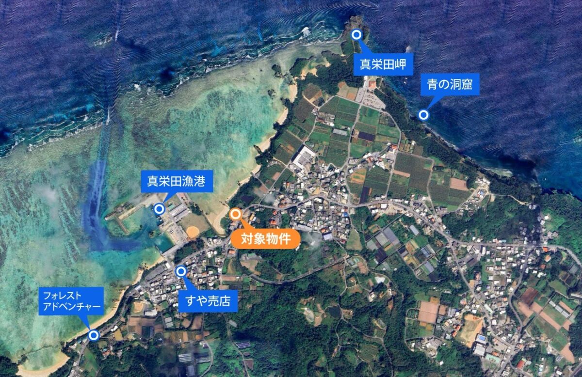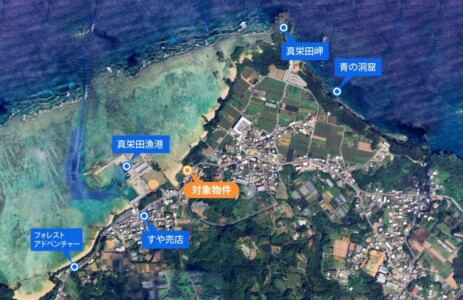 | 備考 | ■現況:ダイビングショップを営業中 ■1F:倉庫/2F:フロント/3F:事務所兼飲食店+テラス(屋上利用可) ■約8台駐車可 ■上下水道あり ■都市計画区域外、準集落地域、自然公園法あり [周辺情報] ・ザネー浜(300m・徒歩約4分) ・真栄田漁港(700m・徒歩約9分) ・フォレストアドベンチャーin恩納(850m・車で約3分) ・青の洞窟(1km・車で約3分) |