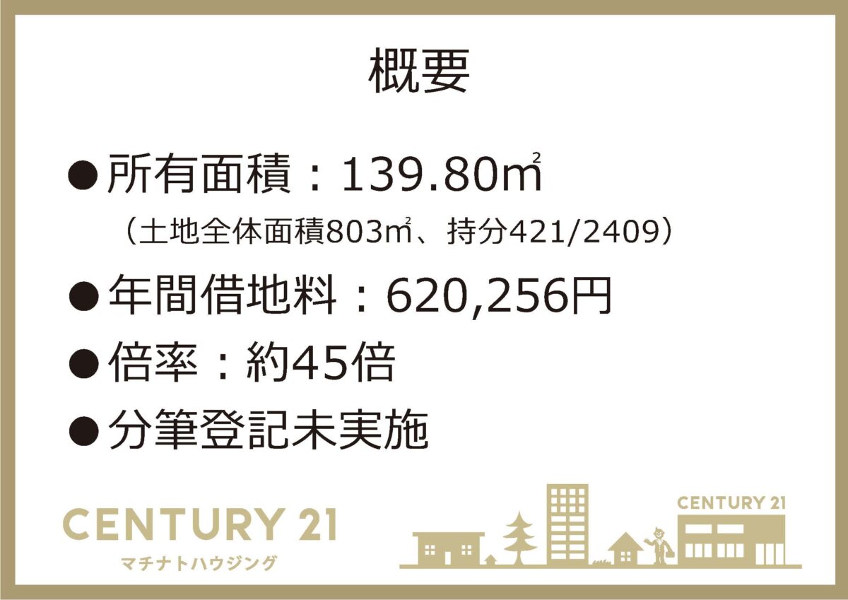 | 備考 | ■所有面積:139.80㎡(土地全体面積 803㎡、持分 421/2409) ■年間借地料:620,256円 ■倍率:約45倍 ■令和7年固定資産税:53,635円 ■分筆登記未実施 |