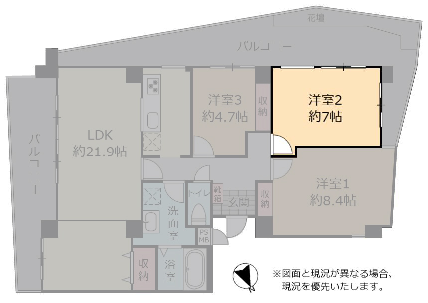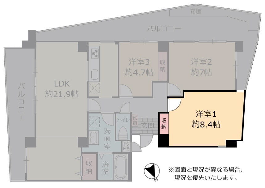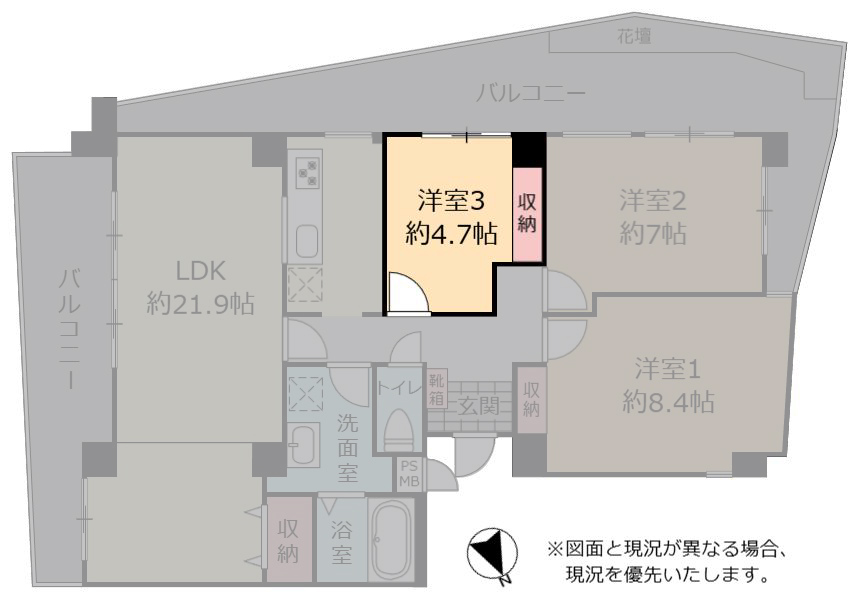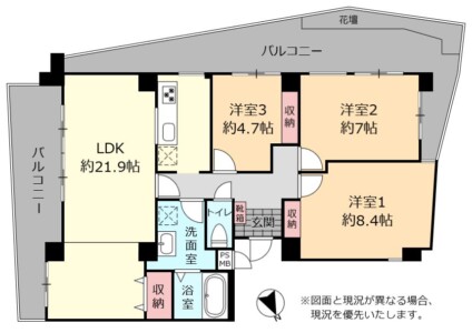 | 間取り | 3LDK(洋 8.4・7・4.7 / LDK 21.9) |